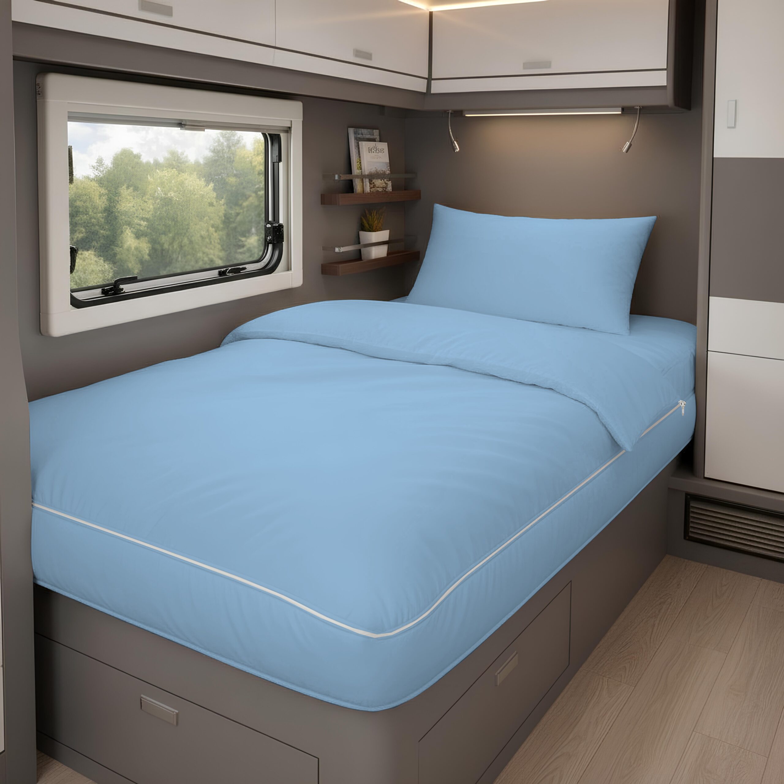 Il copripiumino prontoletto 13 Azzurro per camper è composto da un unico pezzo, simile a un sacco a pelo, che unisce il sacco copripiumino, dotato di una comoda zip su tre lati, a un lenzuolo con angoli con elastico lungo tutto il perimetro. Completa il set la federa coordinata con patella. Grazie a questa speciale conformazione, rifare il letto nel camper non è mai stato così facile e veloce. L’unione dei pezzi garantisce che il letto rimanga sempre in ordine e perfettamente avvolto, anche durante i viaggi più movimentati. Inoltre, tutti i pezzi sono separabili e questo fattore semplifica enormemente il lavaggio, rendendo la gestione della biancheria da letto un gioco da ragazzi.