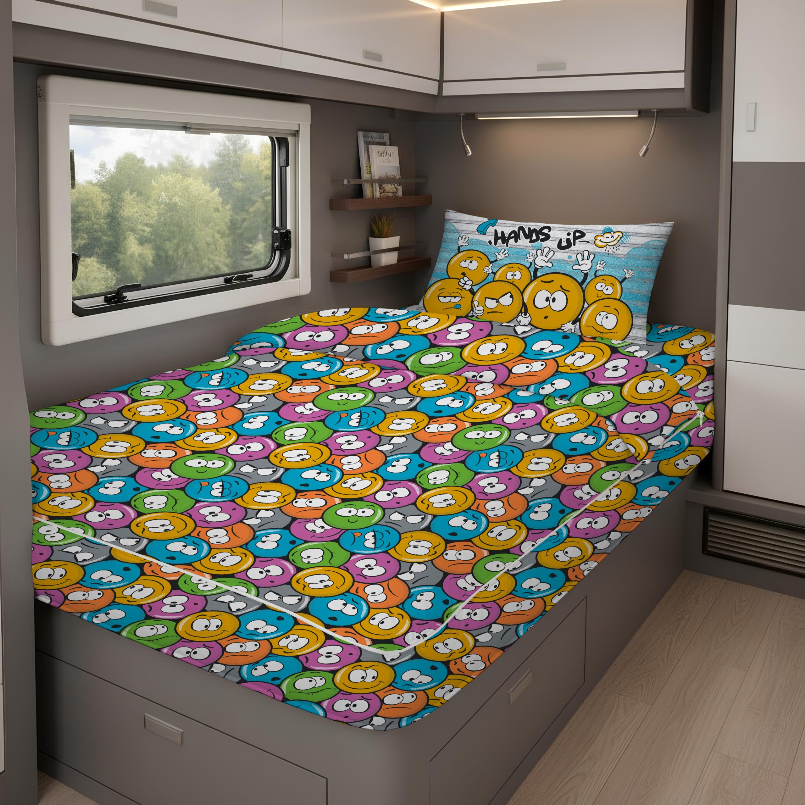 Il copripiumino prontoletto Emoji per camper è composto da un unico pezzo, simile a un sacco a pelo, che unisce il sacco copripiumino, dotato di una comoda zip su tre lati, a un lenzuolo con angoli con elastico lungo tutto il perimetro. Completa il set la federa coordinata con patella. Grazie a questa speciale conformazione, rifare il letto nel camper non è mai stato così facile e veloce. L’unione dei pezzi garantisce che il letto rimanga sempre in ordine e perfettamente avvolto, anche durante i viaggi più movimentati. Inoltre, tutti i pezzi sono separabili e questo fattore semplifica enormemente il lavaggio, rendendo la gestione della biancheria da letto un gioco da ragazzi.
