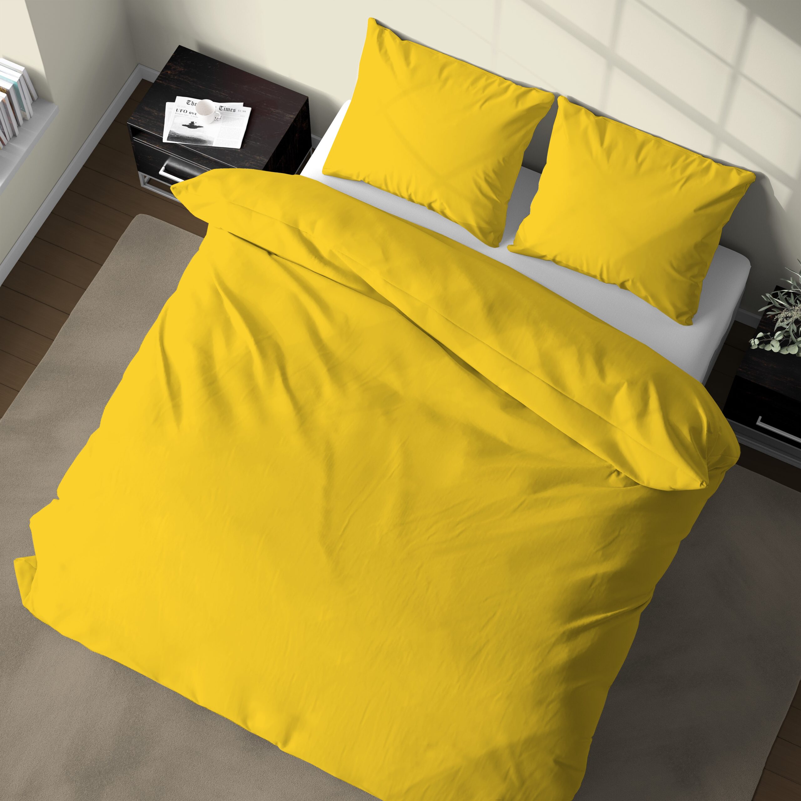 La parure copripiumino Giallo è formata da un pratico copripiumino con patella e da federe con i bottoni.